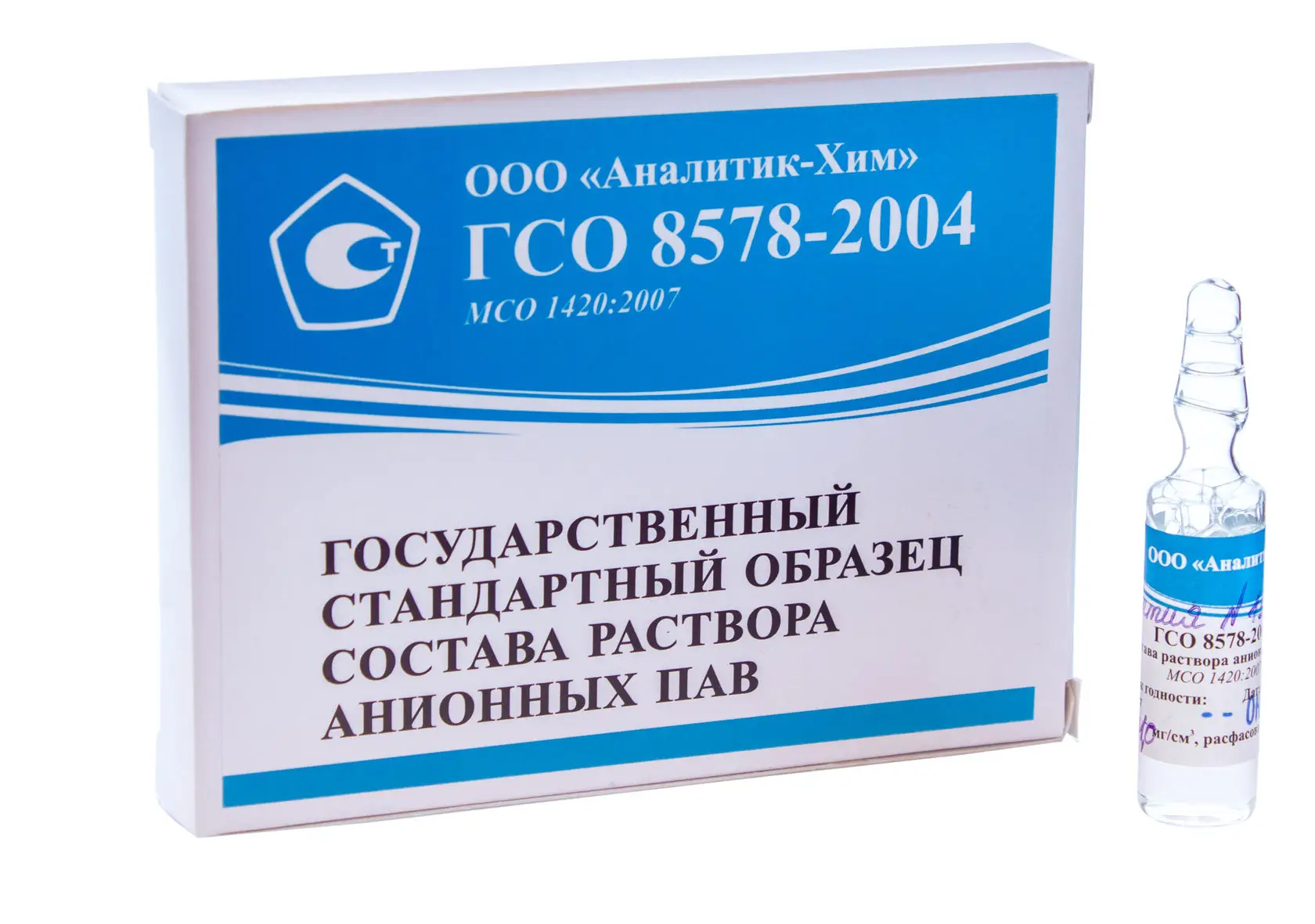 Стандартный образец состава раствора анионных поверхностно-активных веществ (ПАВ) 10 мг/см3 (5 мл) ГСО 8578-2004 МСО 1420:2007 купить с доставкой по России | Химмедсервис