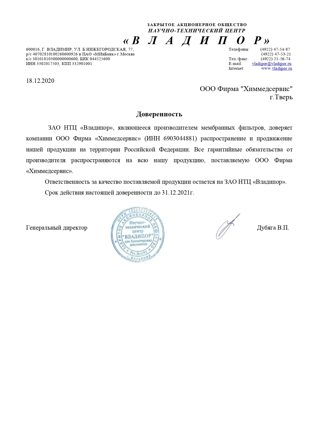 ООО Фирма "Химмедсервис" является доверенным лицом по распространению и продвижению мембран производства ЗАО НТЦ Владипор